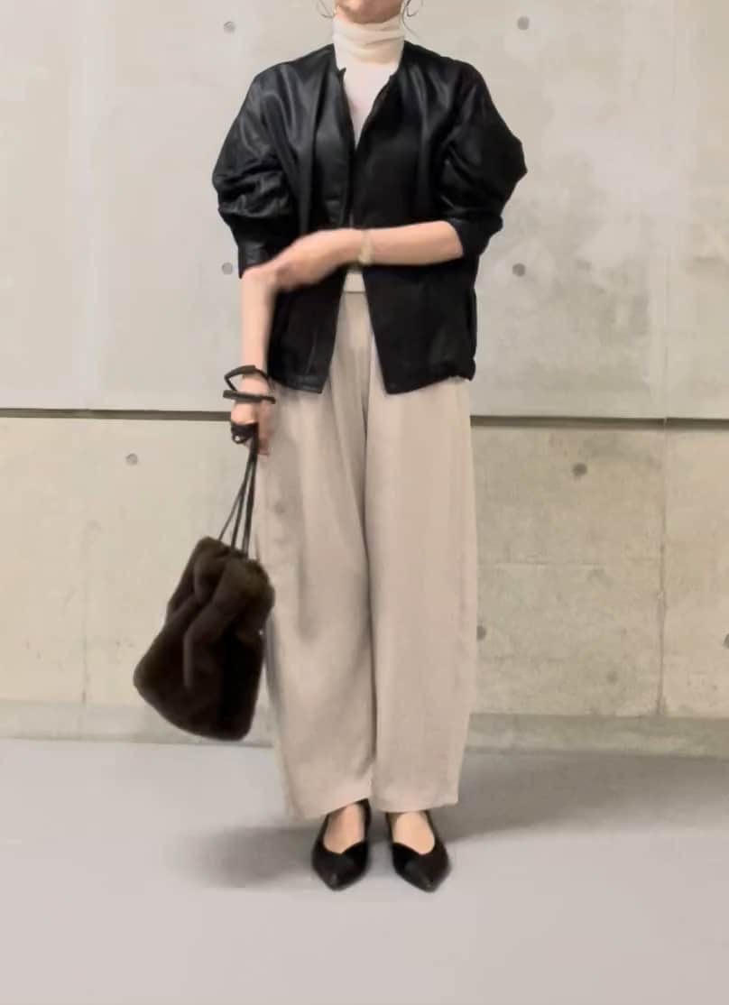 パンツはゆったりしながら落ち感のあるシルエット。冬らしい質感に艶感もありコーディネートのポイントに。丈は少し短めでブーツと合わせても可愛いです。