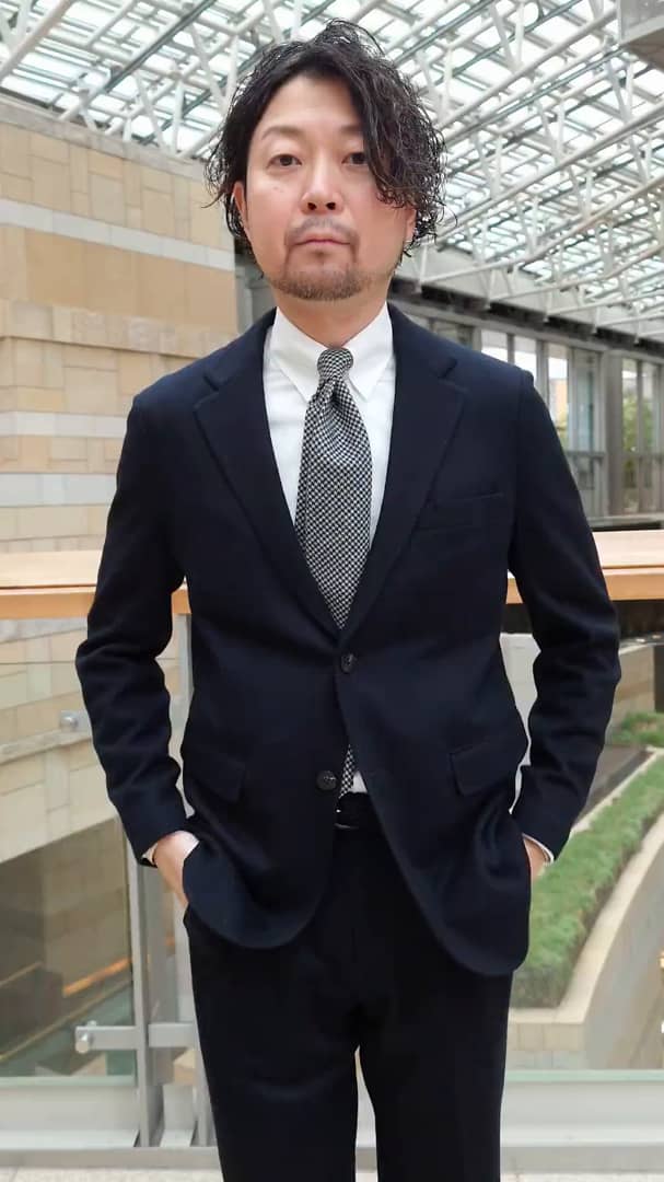 フランネル生地のセットアップに起毛感のあるハウンドドゥース柄のネクタイを合わせたスポーティーなドレススタイル。モノトーンで構成することで、起毛感のあるセットアップもスタイリッシュにコーディネート。