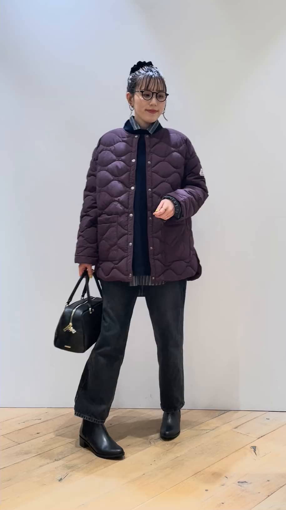 そこまで肉厚ではなく、ライトな着心地で気軽に羽織れます。ダウン特有の着膨れ感もなく、中に着込んでも安心です。ボルドーカラーですが濃い目のパープルにも見えます。