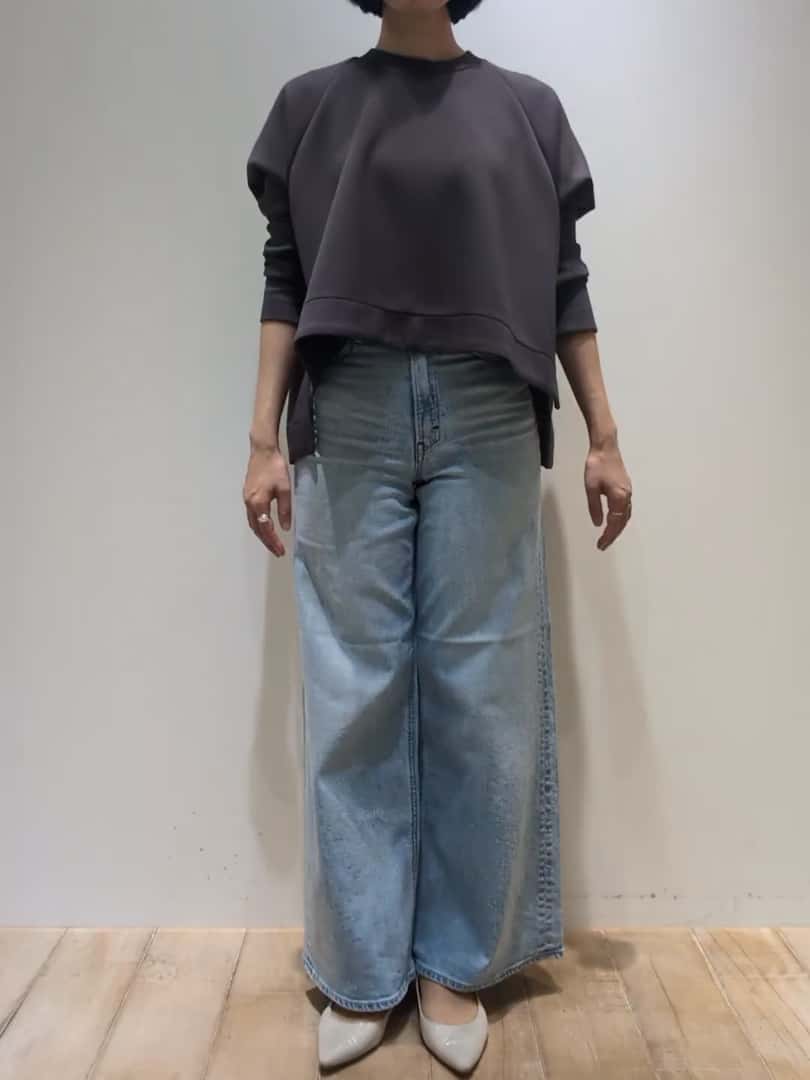 前はやや短めの着丈で、後ろはヒップをカバーしてくれます。立体的なボックスシルエットでシンプルなのに1枚で決まるトップスです。