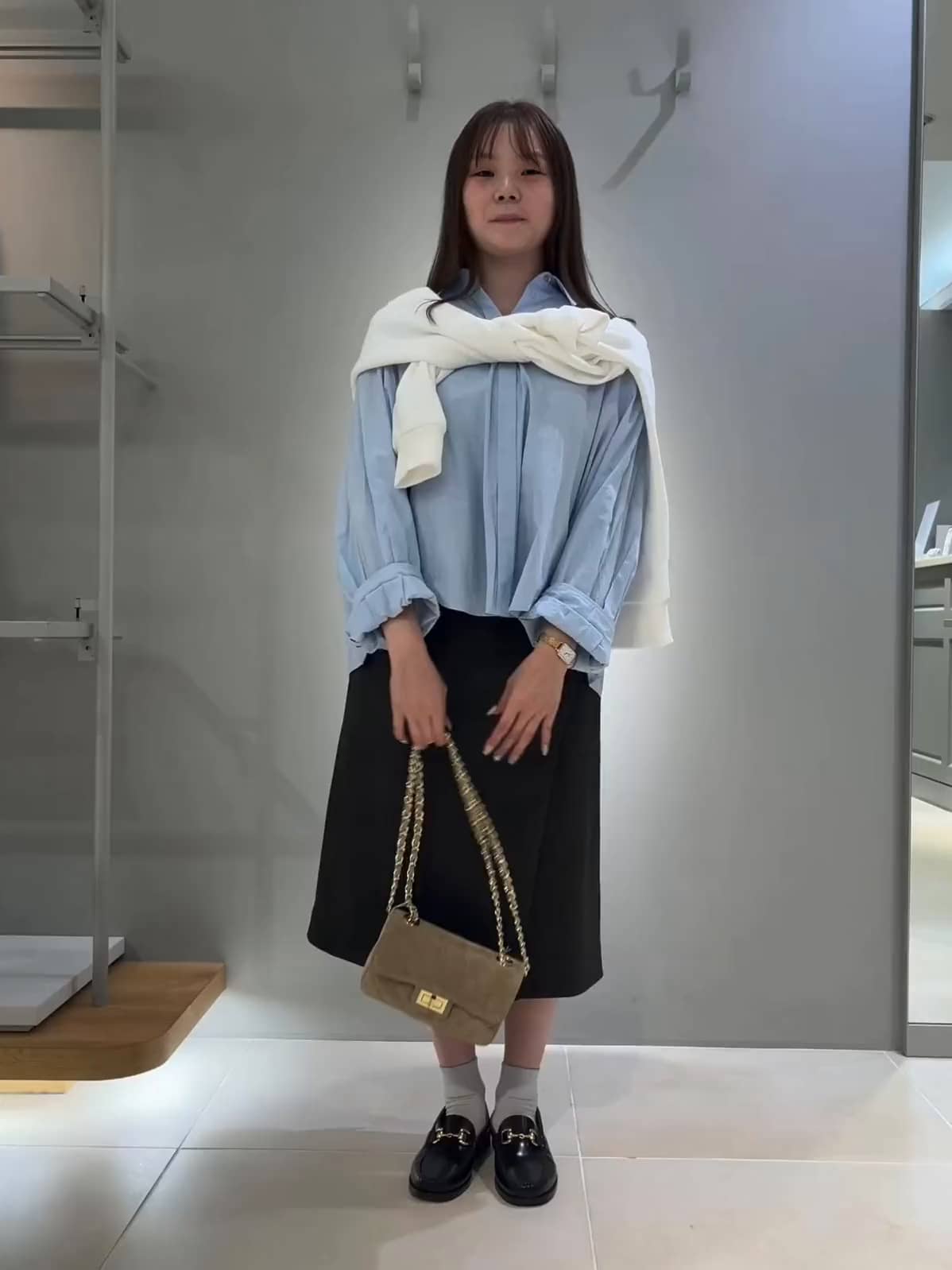 膝下の丈感でほんのり足が見えますが、ブーツやローファーなど足元を変えることによって、雰囲気も変えれます🫶🏻