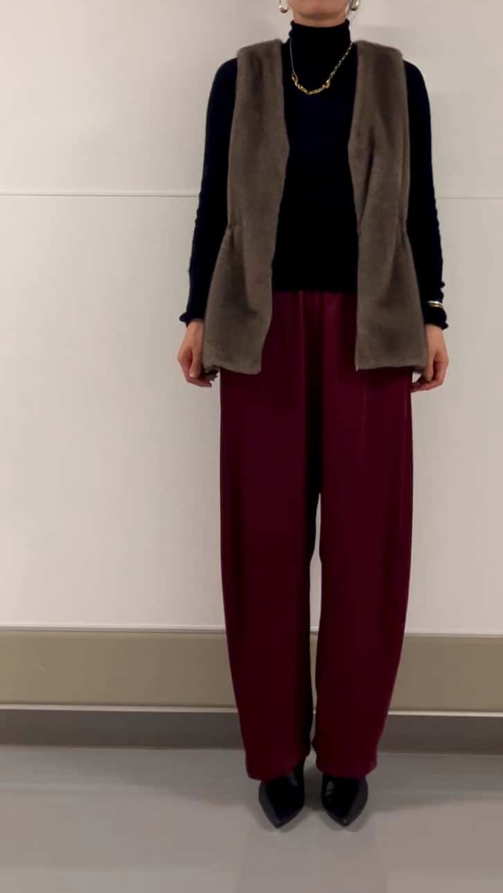 細く滑らかな毛足が本物みたいなフェイクファージレです。肩幅を細身に取っているのでスッキリと着られるのもポイント!ウエストは絞れるので、シルエットもボリューが抑えられます。