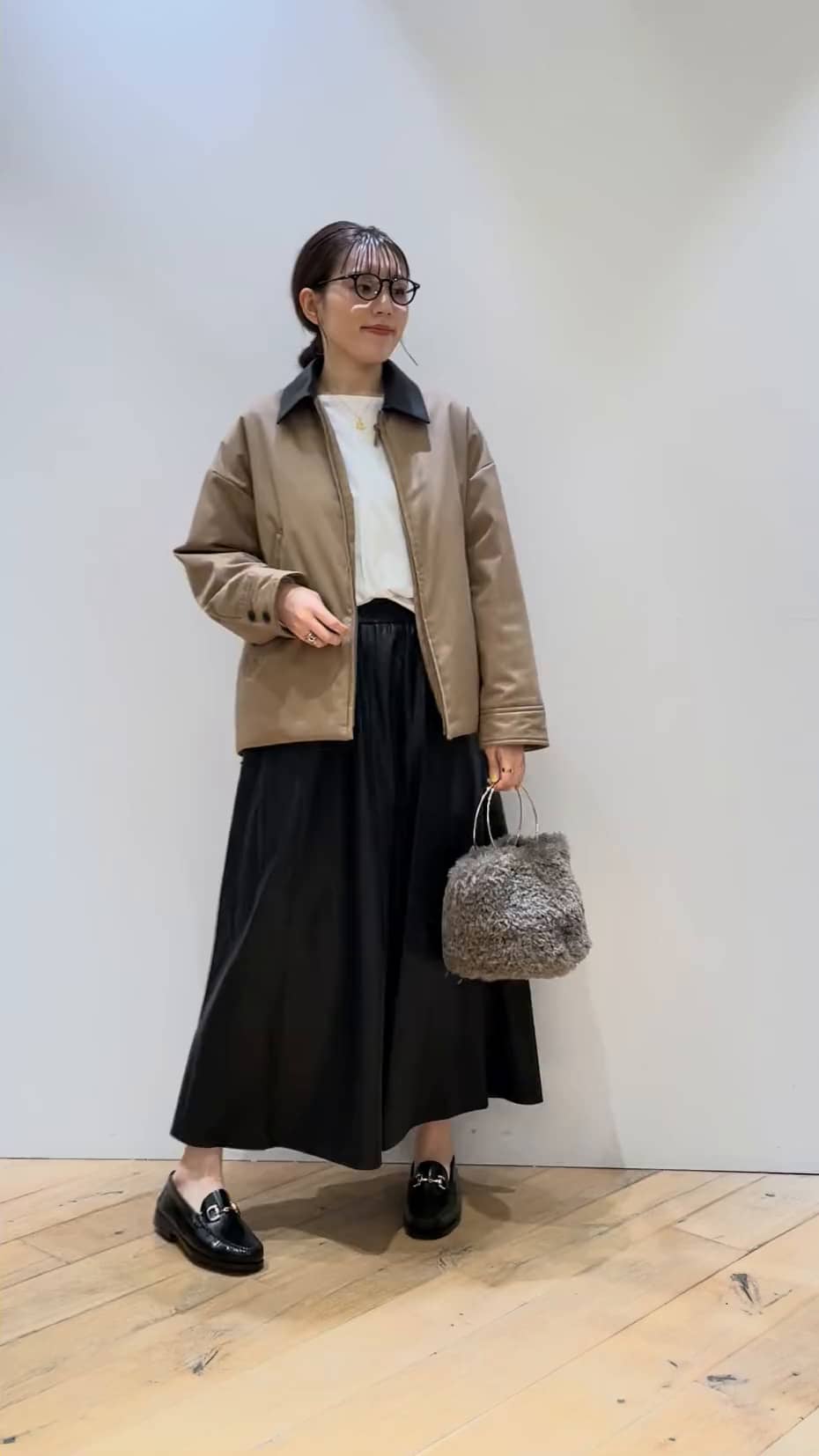 フェイクレザーを使った雰囲気のあるスカートです。ふんわりボリュームがありつつも、軽い生地感。両サイドにポケットがあるのも嬉しいポイント。