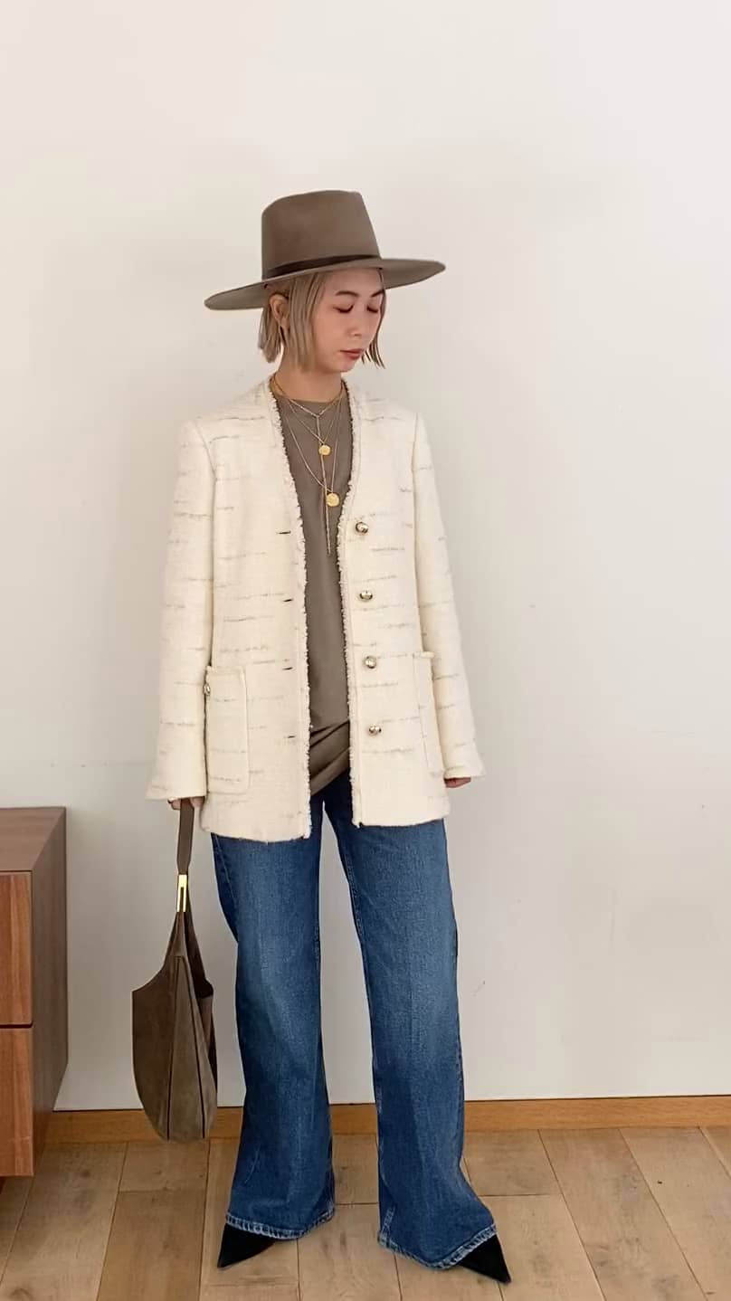 【スタイリングポイント】ツィードジャケットstyling!デニムやハットで少し遊びのある着こなしに。