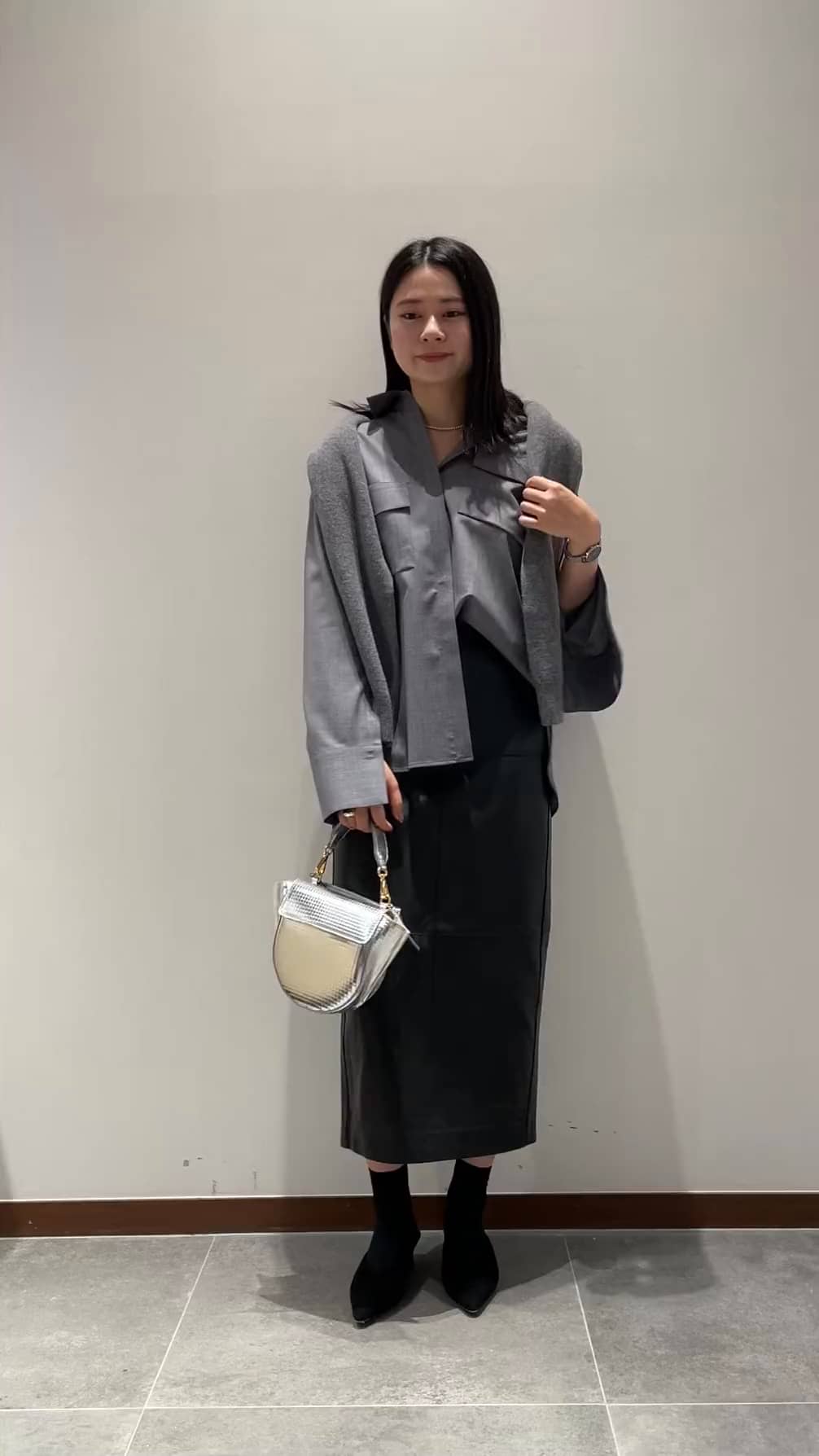 グレーのシャツにレザースカートを合わせて、女性らしくもクールなコーデに。