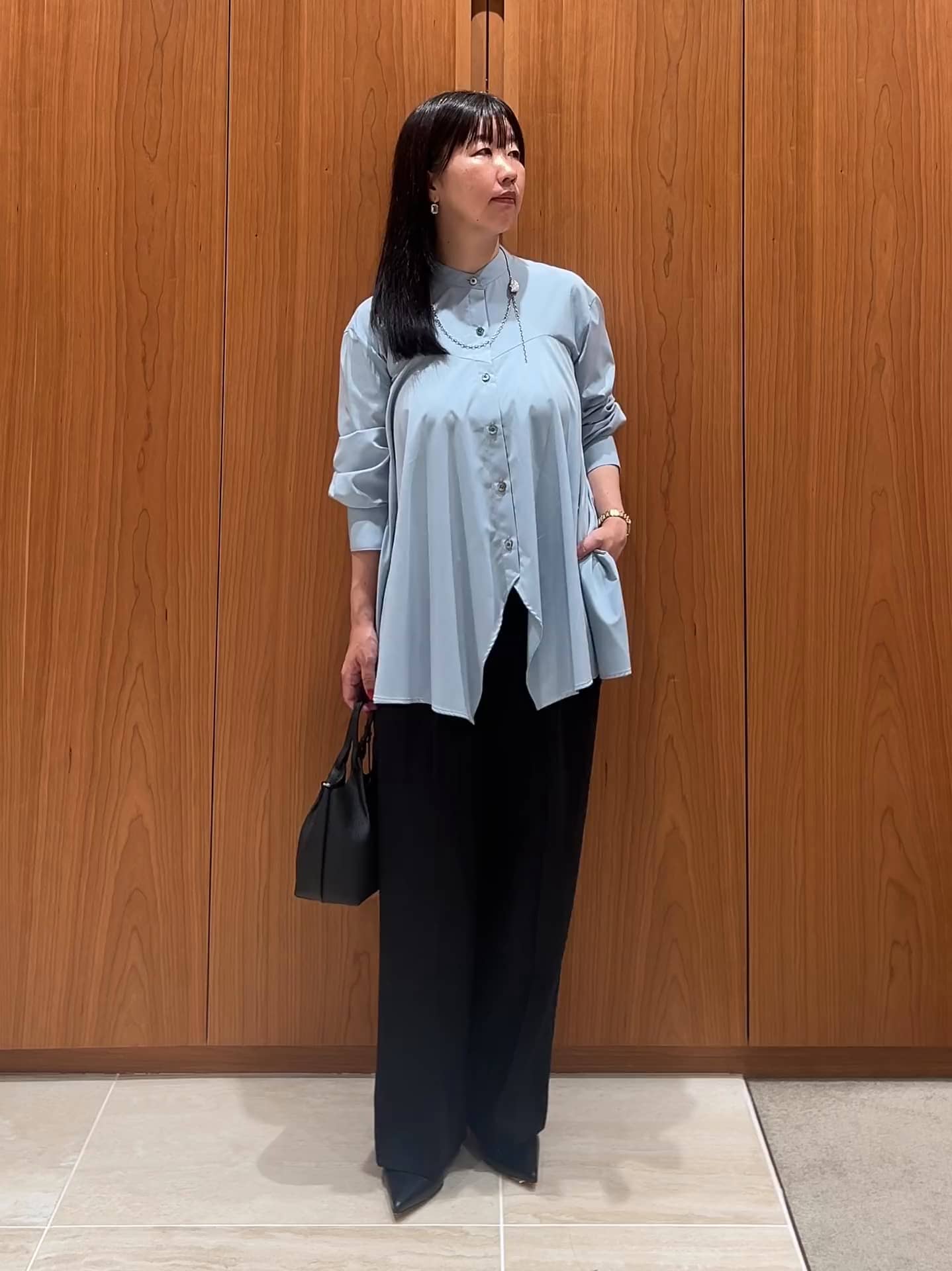 コメント:シワになりにくいブルーのシャツはレイヤードにもおすすめ。柔らかくストレスフリーな着心地です♪