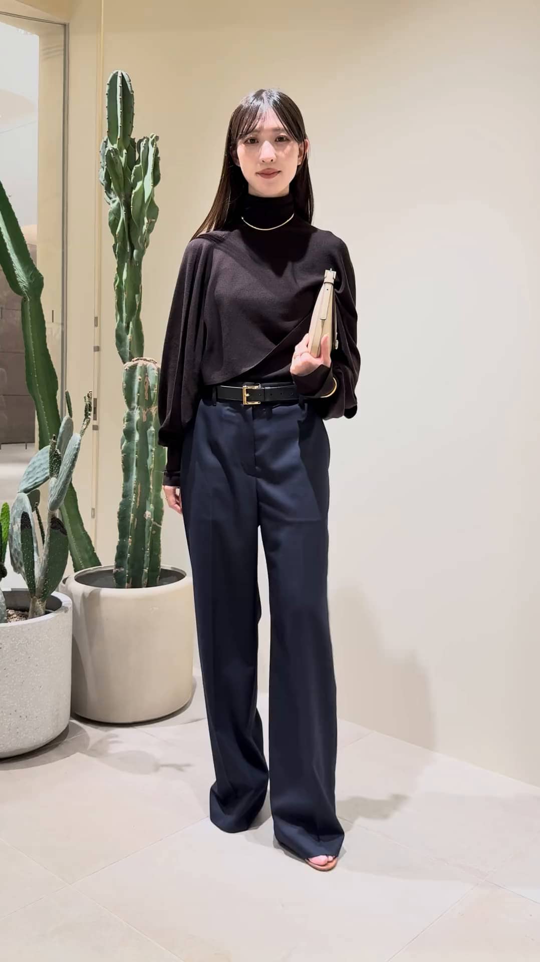 デザイン性の高いレイヤードトップスが映えるよう全体の色味はシンプルに落ち着いたトーンでまとめ、ジュエリーやバッグを差し色にコーデを組みました。
