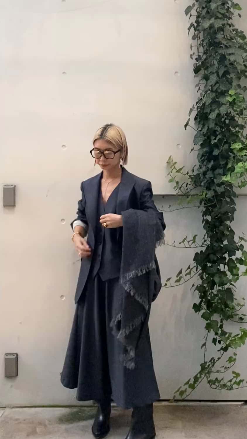 【スタイリングポイント】セットアップstyling!同色のストールを合わせてウォーム感をプラス。アイウェアやブーツはブラックでメリハリのあるコーディネートにしました。