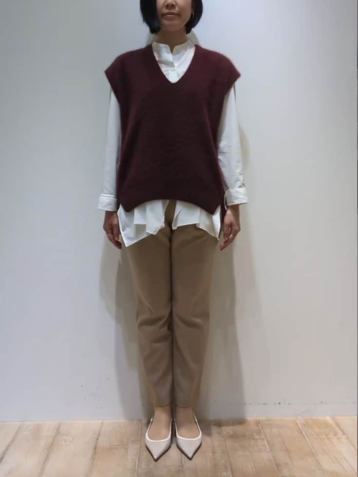 ゆったりしたフォルムで大きなVあきの毛足の長いニットベスト。レイヤードスタイルがしやすいシルエット。シャツやタートルカットソーなど合わせるインナーで雰囲気が変化します。