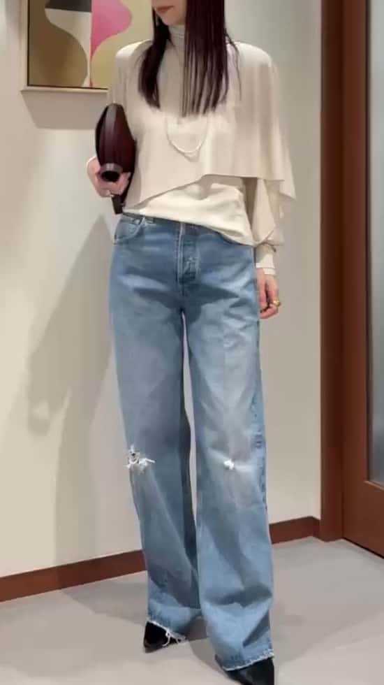 秋冬の定番タートルニットにボリュームスリーブとドレープがエレガントな印象を与えてくれるストールニットをレイヤード。デニムと合わせて大人カジュアルなスタイリングに。