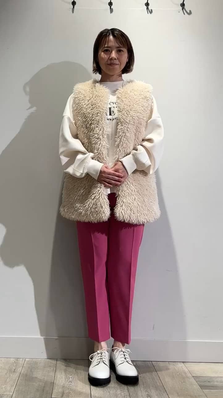 →いつものコーディネートにプラスしやすいゆったり羽織れるファーベストです。軽くてポケット付きなところも気に入っています。