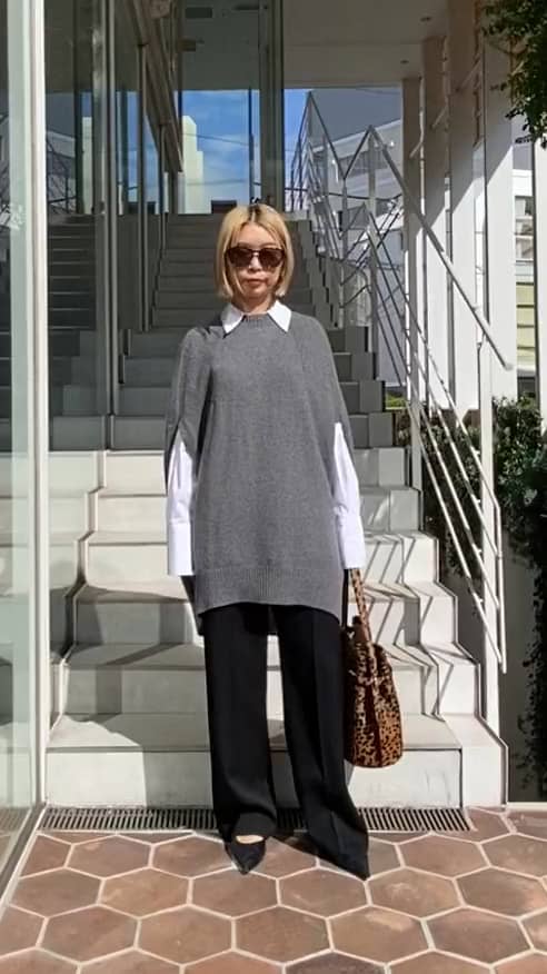 【スタイリングポイント】ポンチョstyling!メインのニットを活かしてシンプルにシャツと。バッグでレオパードを取り入れてよりクラス感のある着こなしにしました。