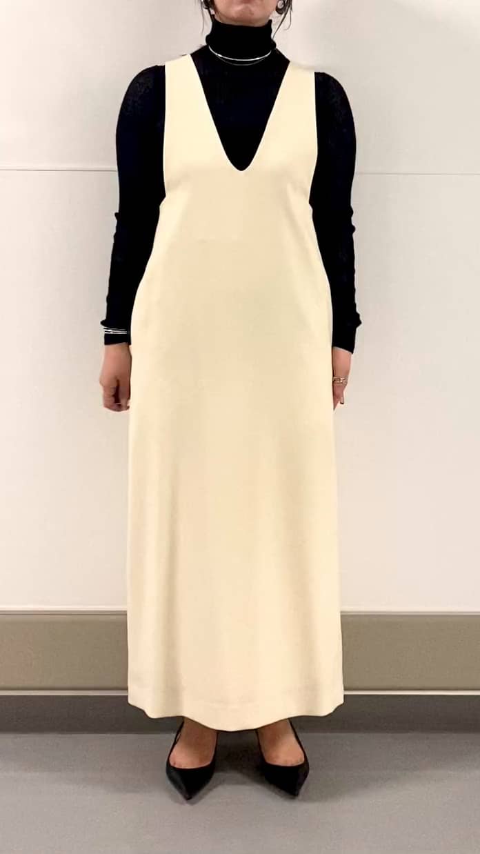 サイズ感:身幅はゆとりがり、後ろでウエストを調節できます。首周りがVカットでスッキリしたデザインなので、子供っぽくみえません。