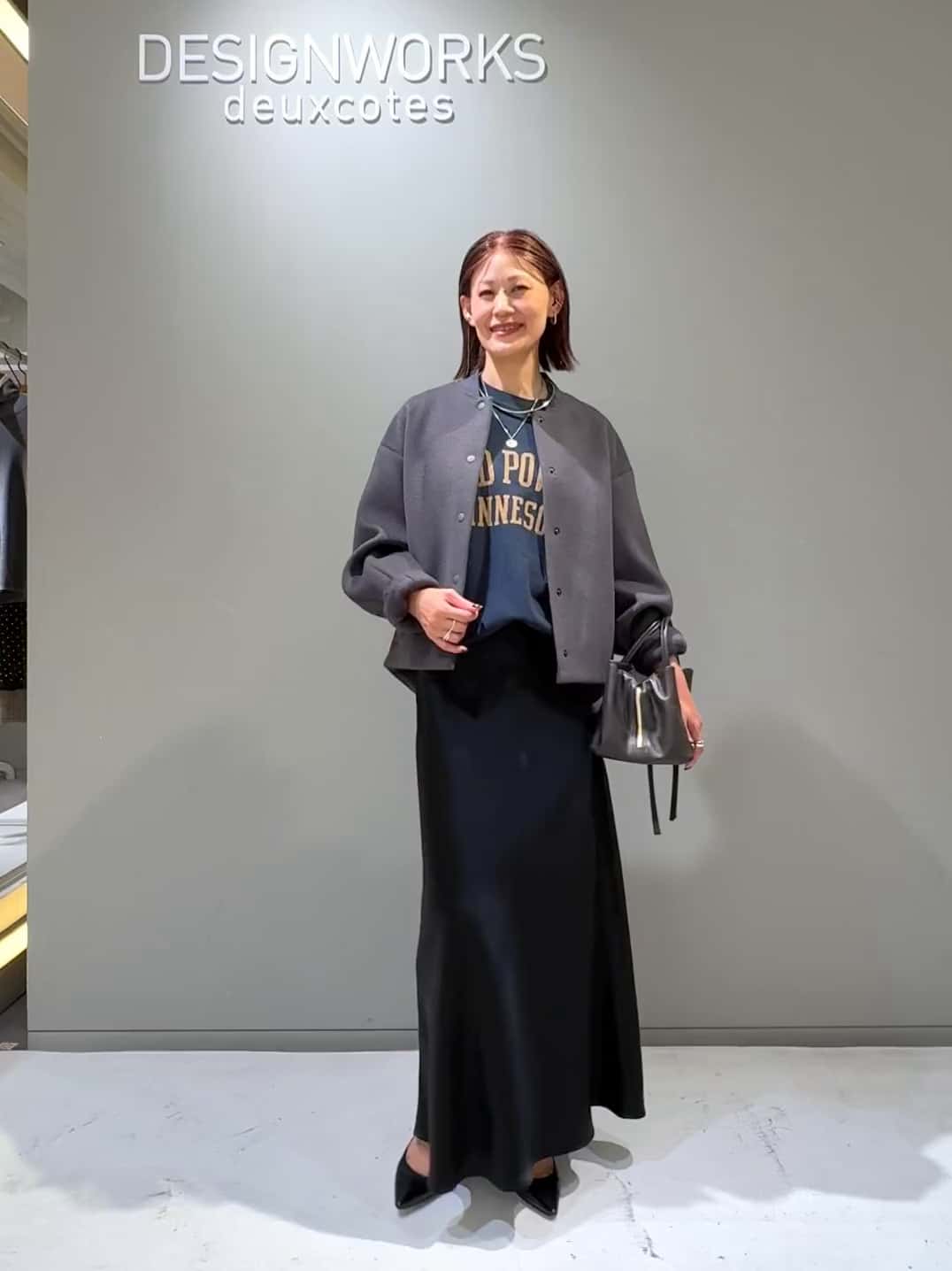 スタジャン×スウェットのカジュアルアイテムをキレイ目サテンスカートで合わせたミックスコーディネートです。