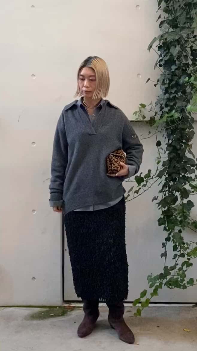 【スタイリングポイント】レイヤードstyling!シャツを重ねて奥行きのあるコーディネートに。フェザーヤーンの動きのあるスカートを合わせて華やかさをプラスしました。