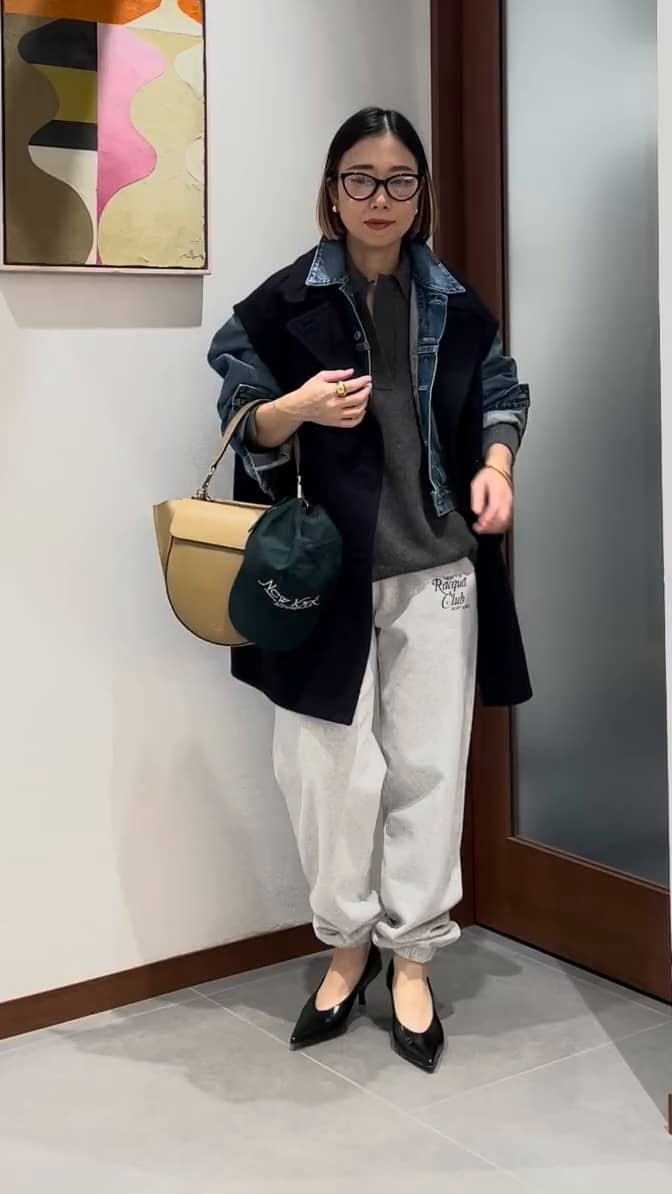 両色欲しいくらいどちらも合わせやすい色合いのピーコートベストですが、ネイビーはスウェットなどのスポーツmixなstylingがオススメです。