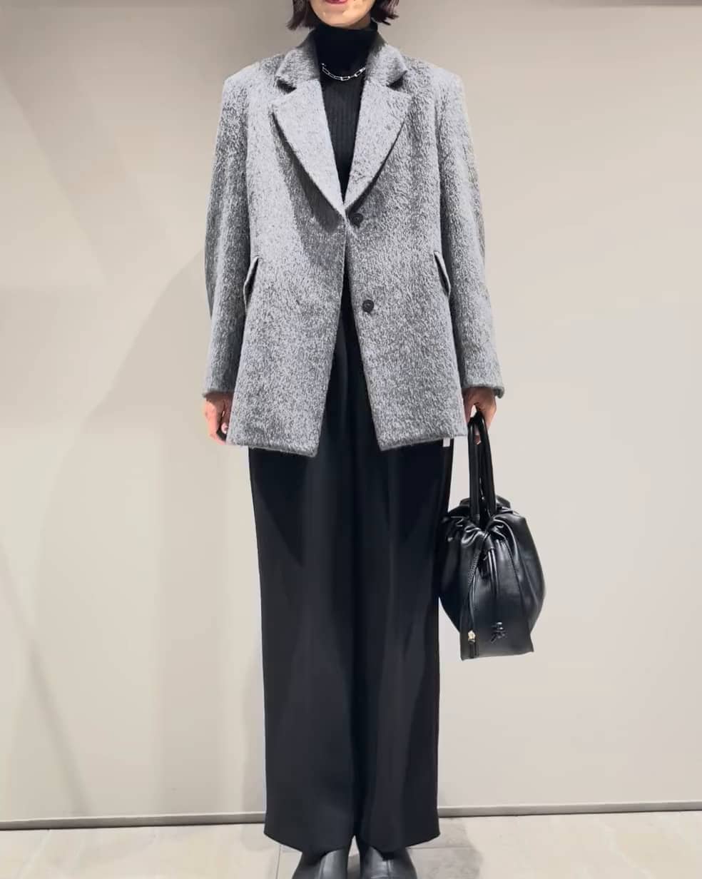 肩パッド入りのオーバーショルダーがマニッシュな印象のジャコット。