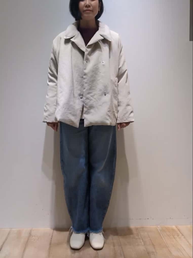 ゆったりしたシルエットのミドル丈ダウン。袖はドルマンスリーブで中にも着込めるゆとりのあるサイズ感です。襟元はスナップで首元まで留められ仕様。オンオフ兼用で着られます。