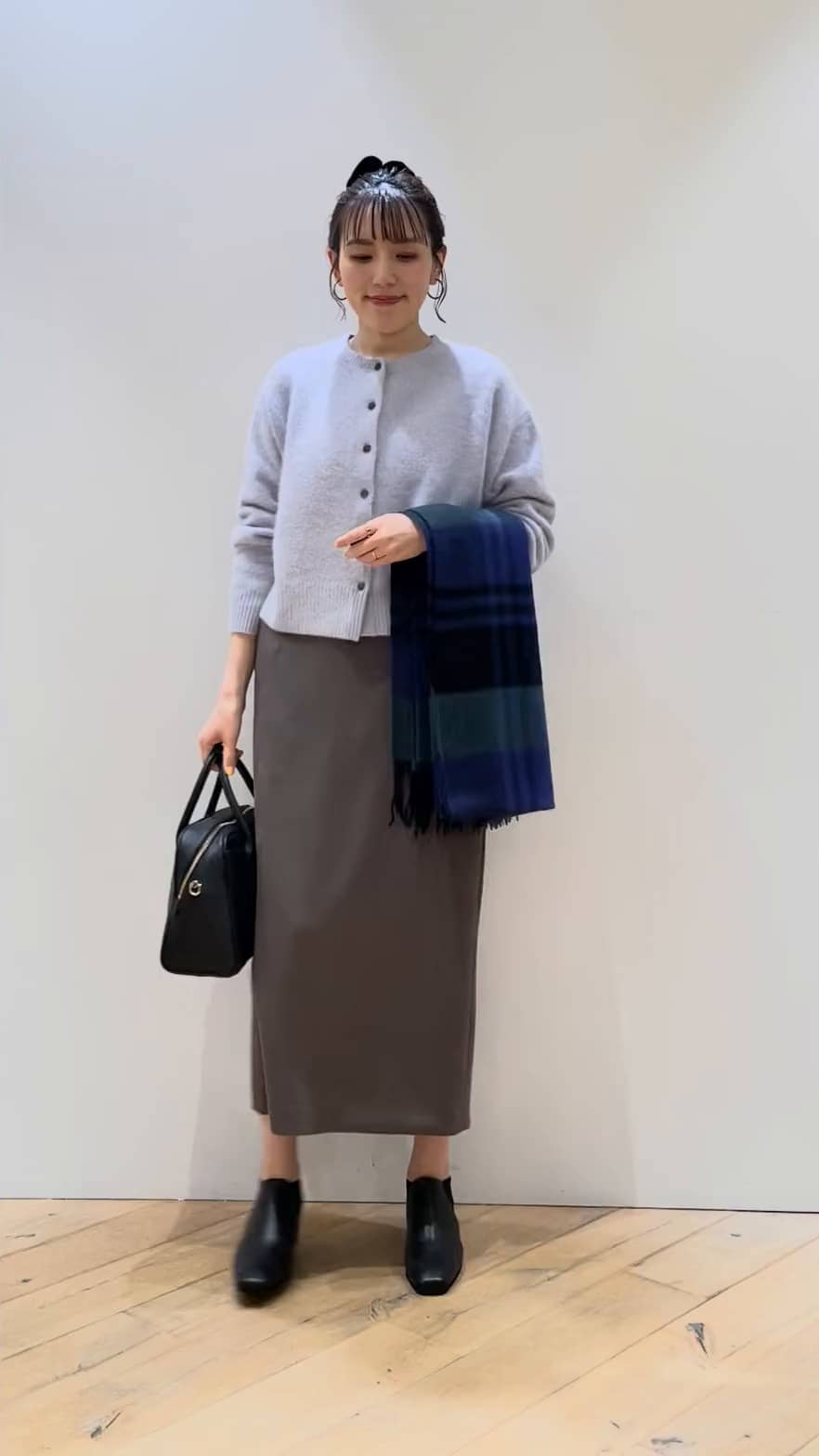 ウエストの後ろ部分がゴムで、ストレッチも効いており、ストレスフリーな履き心地です。着丈は膝下くらいで、ブーツやローファーなどと合わせやすいです◎