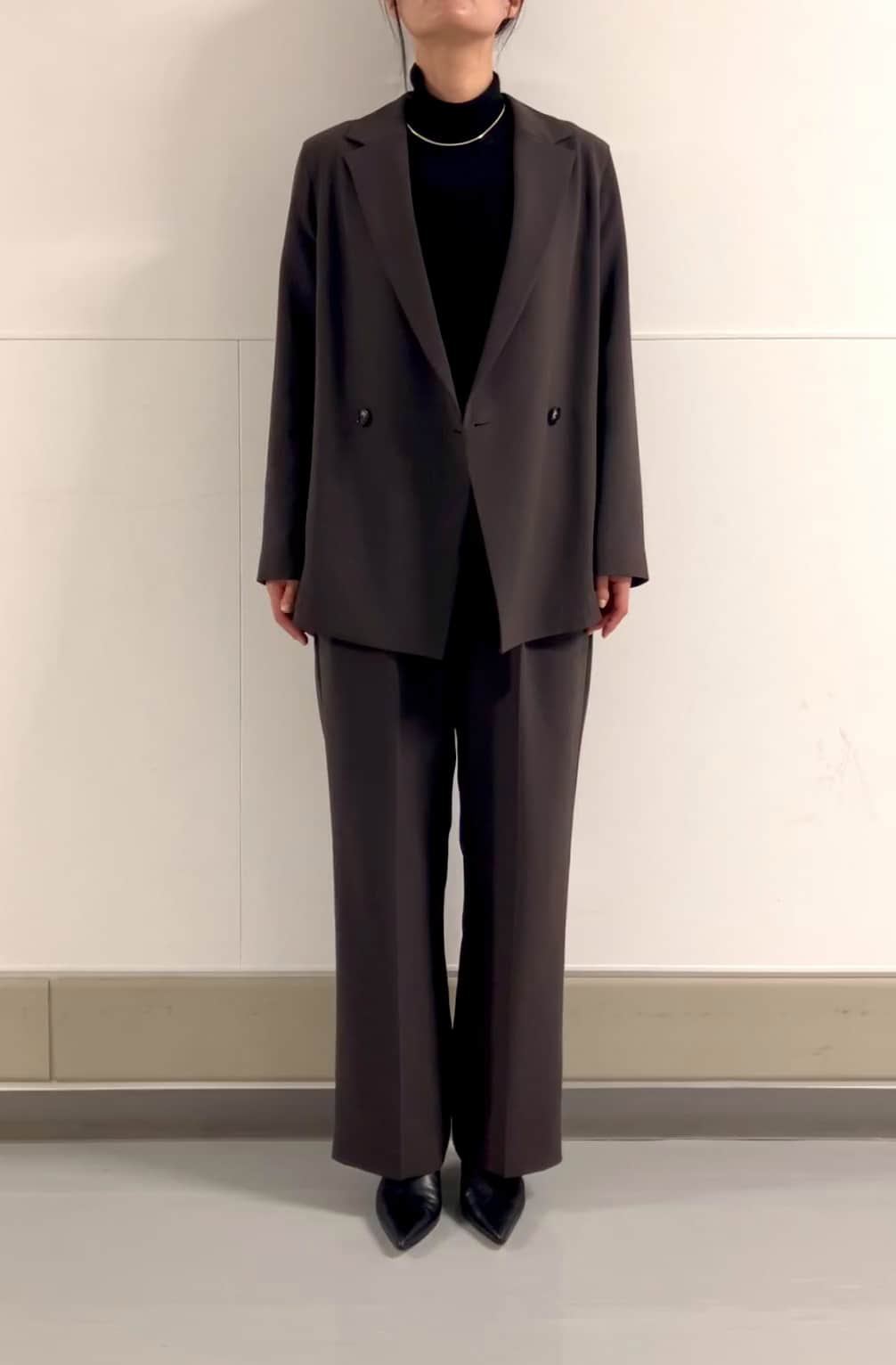 シワにもなりにくく軽い着心地で、肩周りもキツくないストレスフーのジャケットです。前開きで着た時の裾のシルエットがシャープでマニッシュな印象になります。重くなりすぎないダークブランのカラーもおすすめです。