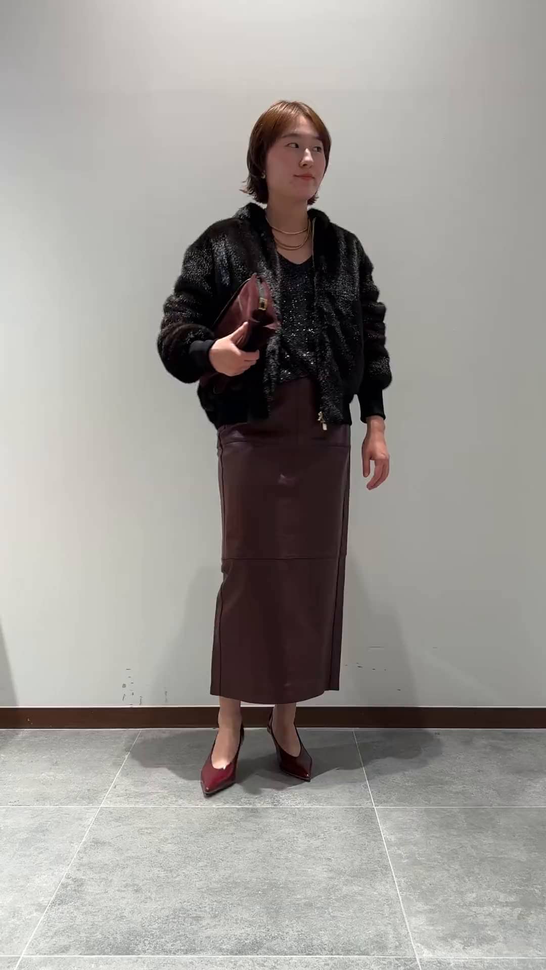 ラメやファーなどの女性らしいゴージャスなアイテムをレザーと合わせることで大人なスタイリングに。