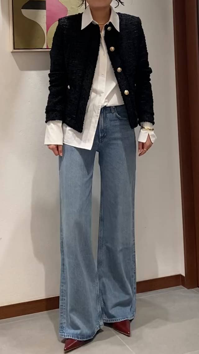 ツイード×シャツのカチッとしたレイヤードにデニムを合わせることで、決まりすぎない上品なスタイリングに◎