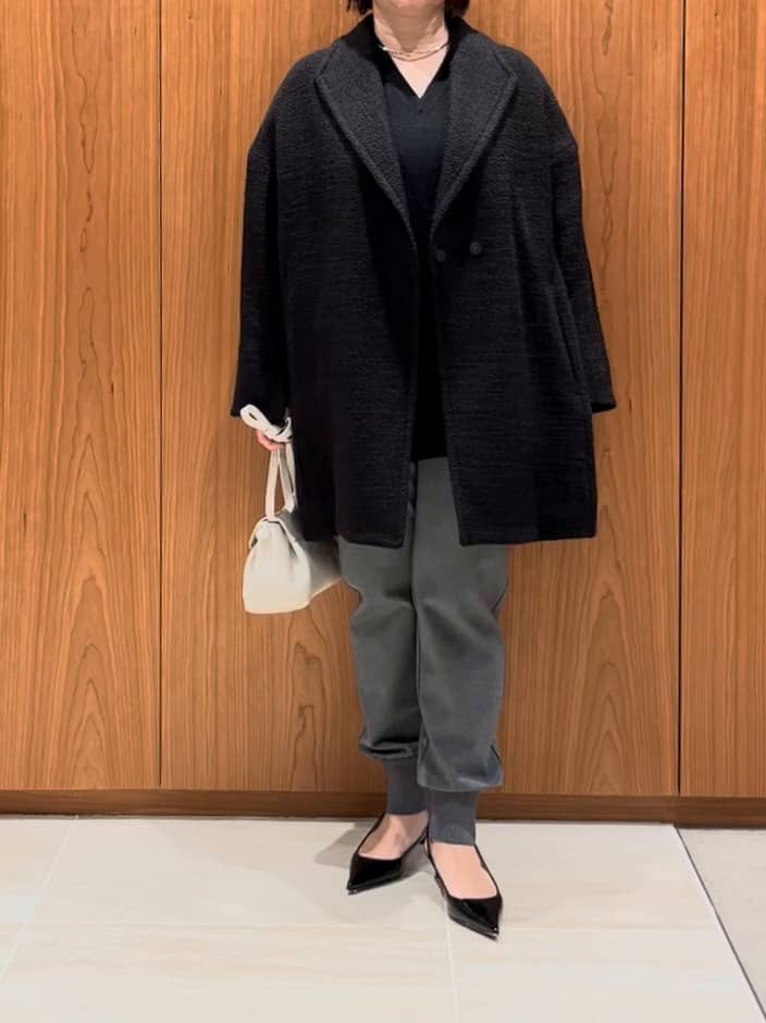 ブラックとブラウンの糸で織られた表面感のある素材が、高見えするイチオシのハーフコートです!
