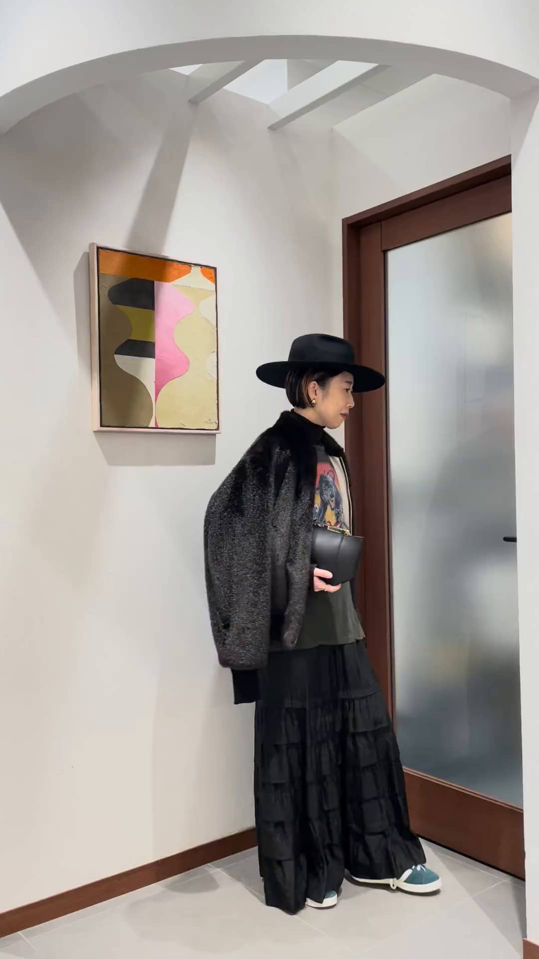 リアルファーのような艶やかな毛足のエコファーブルゾンやZANCETTIのクラス感たっぷりのバッグを主役にスニーカーやヴィンテージTで抜けを出した大人のホリデースタイル。