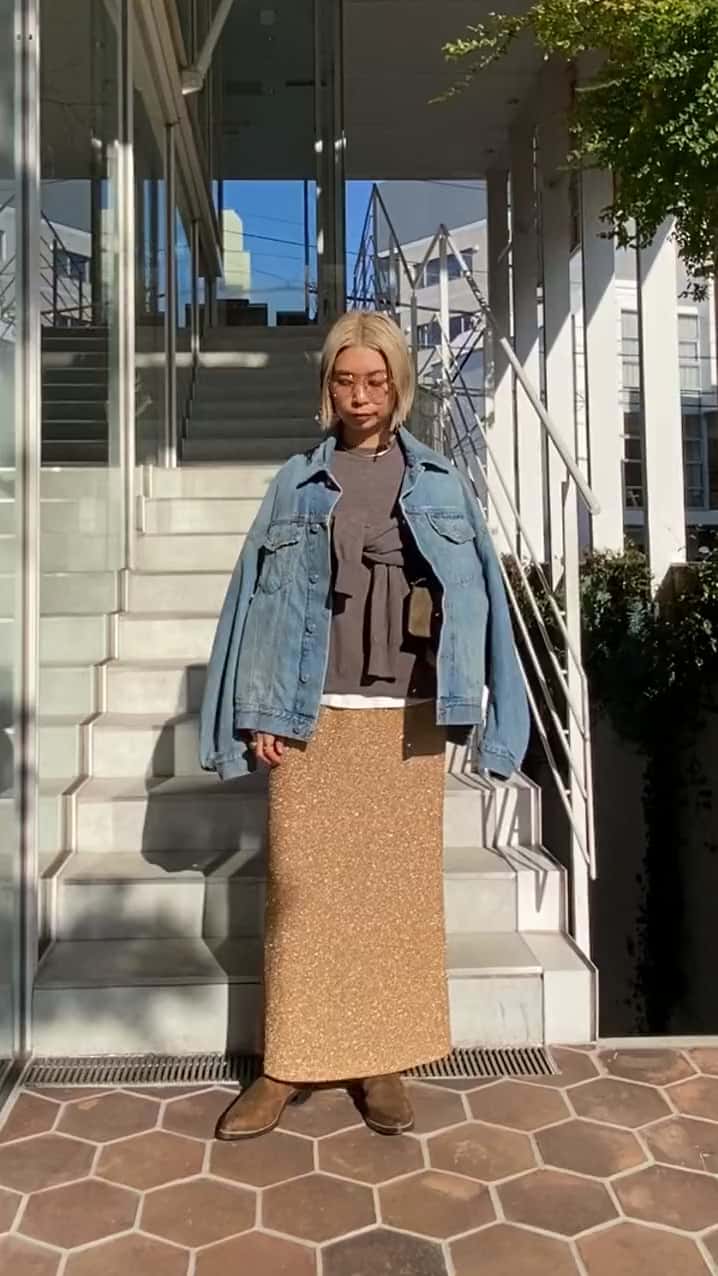 【スタイリングポイント】カジュアルなholidaystyling!華やかなラメスカートを主役にデニムジャケットでラフに仕上げました。