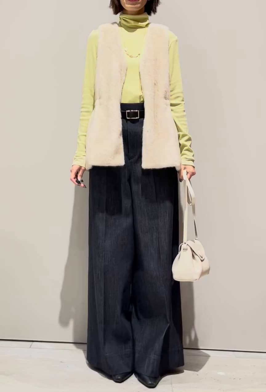 フェイクファーですが、リアルミンクのような光沢感と滑らかな手触りで高見えするジレ。