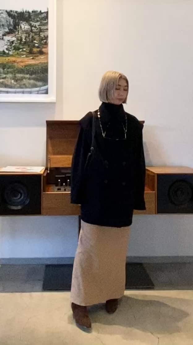 【スタイリングポイント】holidaystyling!Pコートベストを上のボタンまで閉めてシックな装いに。グラスチェーンやラメスカートを合わせてholiday気分の盛り上がるスタイルにしました!