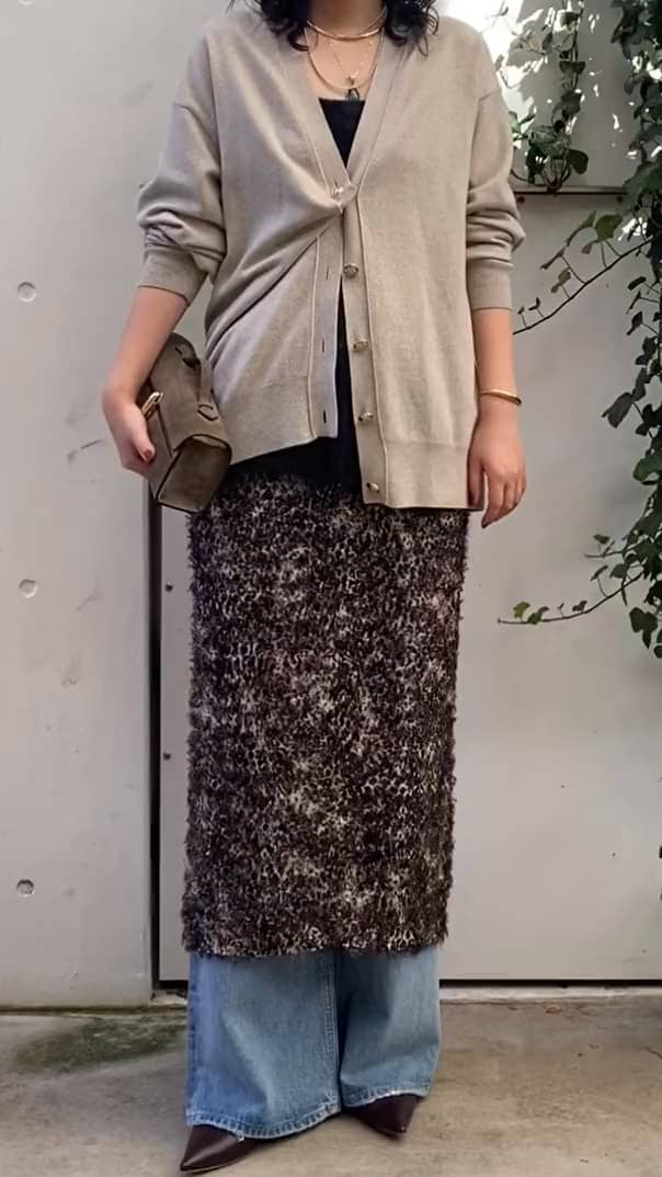 スカートとデニムをレイヤードし、甘すぎずこなれ感のあるスタイリングに。
