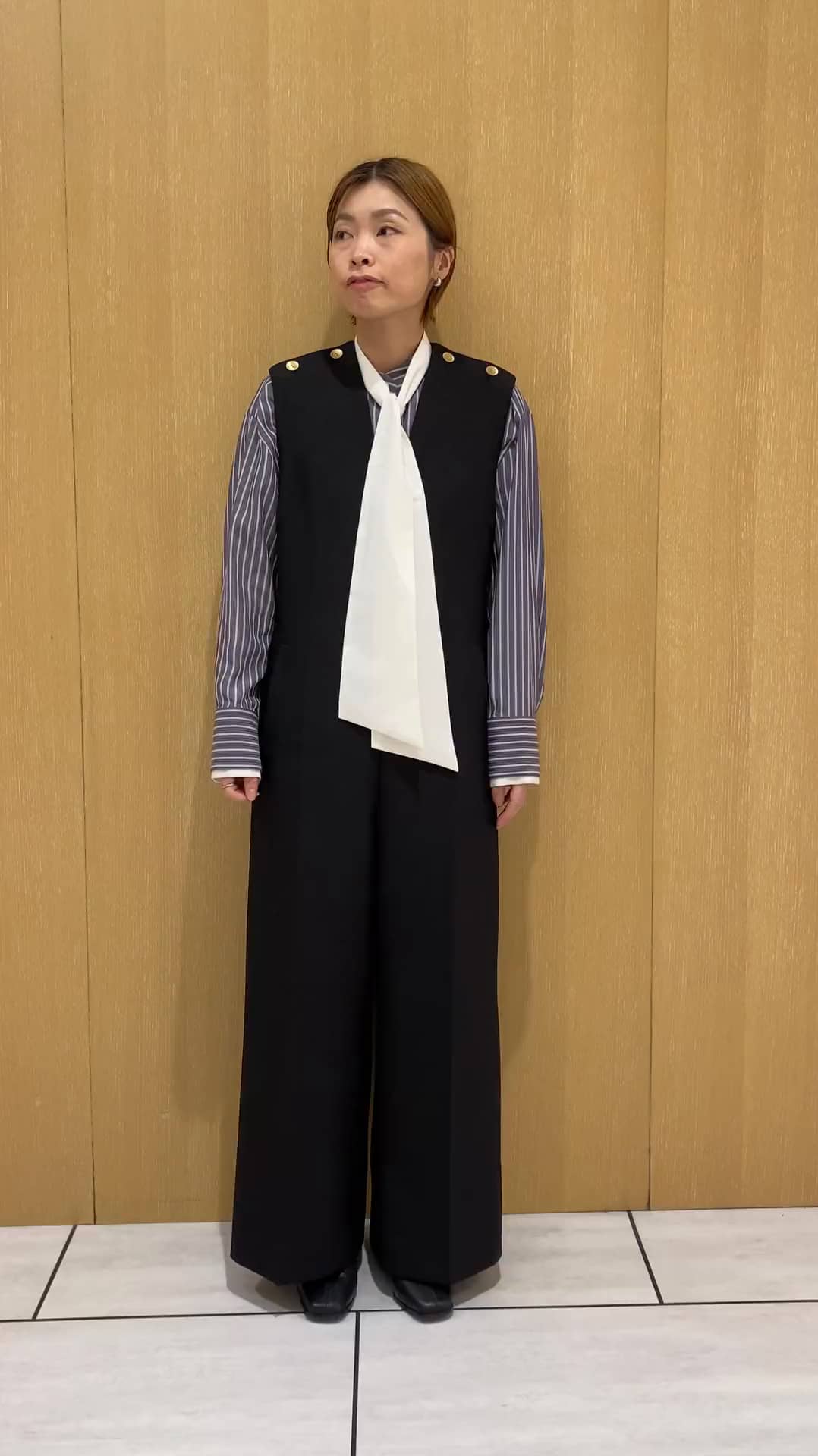 長めのセンタープラスで脚長効果抜群です☺️肩のゴールドボタンが華やかさをプラスしてくれます。楽なのにカチッと見えるので綺麗目シーンでも大活躍♫