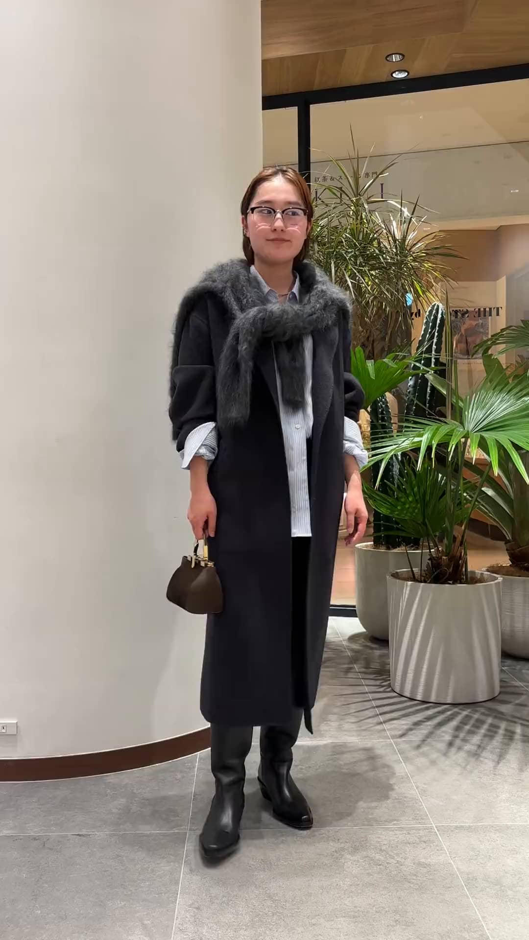 グレーのワントーンでまとめながらも、ファーを使ったり小物で少しブラウンをさすことでこなれた印象に。
