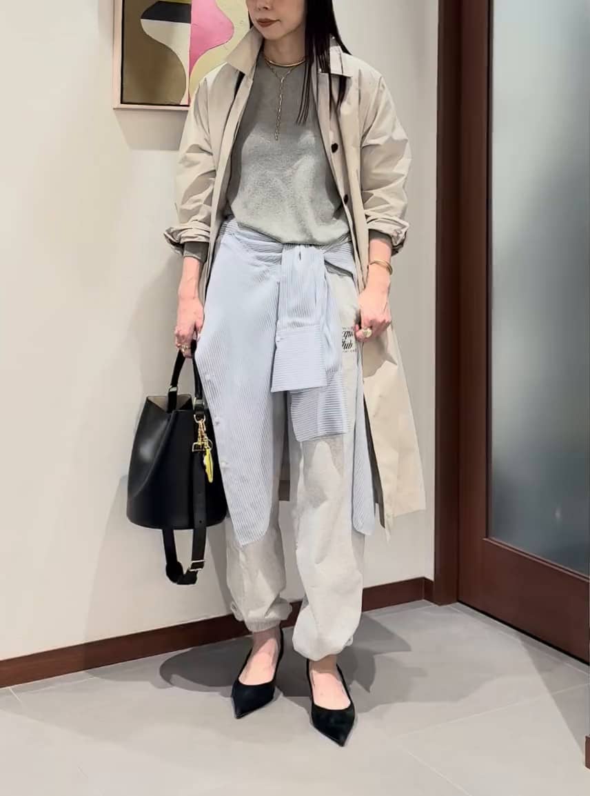 ニットとスウェットパンツのグレーのワントーンに爽やかなブルーシャツで春を意識したリラクシーなスタイリングにタフタ素材のハリ感と軽やかさがシャープな印象のスプリングコートをプラス。