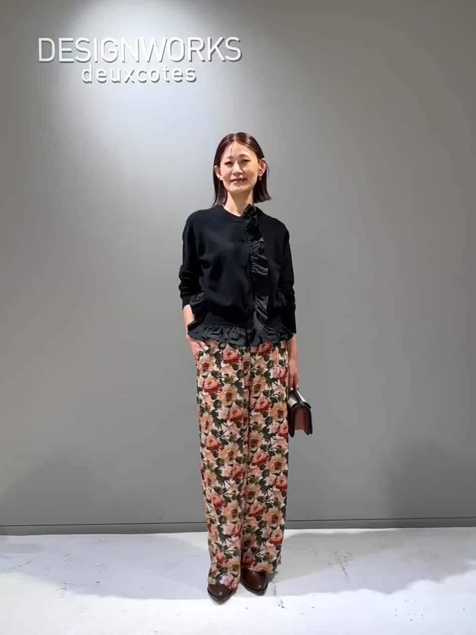 タフタフリルのデザインニットでリズムを付けつつ、華やかなプリントパンツにはブラックのトップスでシックにまとめたコーディネートです。
