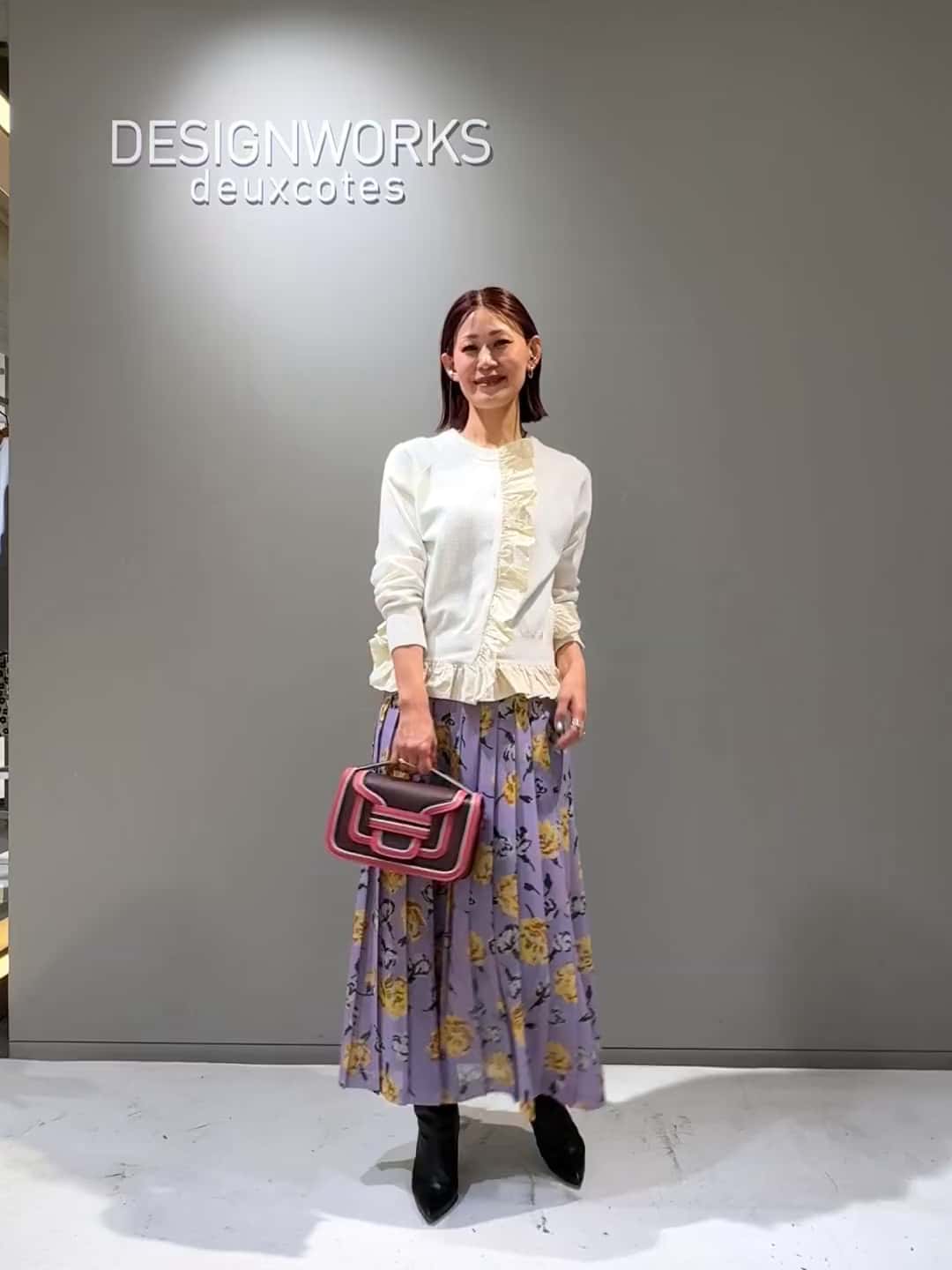 フリルデザインのニットと柔らかなラベンダーカラーのプリーツスカートでフェミニンな印象のレディーライクなスタイリングです🌸