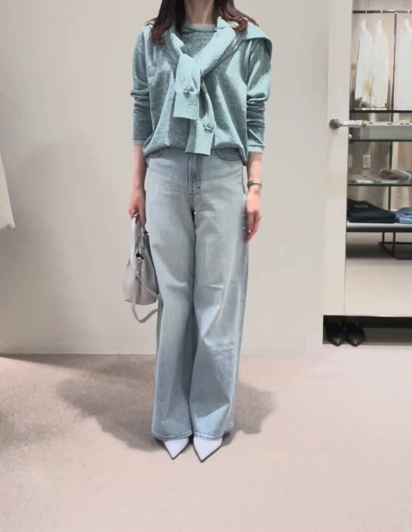 腰回りはスッキリ裾に向かって広がるフレアデニム。程よいボリューム感でバランスのとりやすいアイテムです。美脚効果もありながら淡い色合いとブルーのグラデーションがスタイリングに軽さを出してくれるのでこれからの季節にもオススメのデニムです。