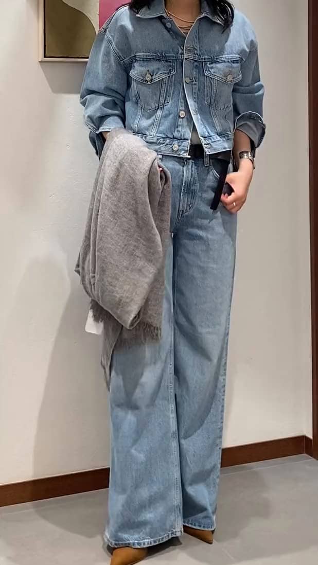 スエード素材のシューズやストールを合わせることで大人なデニムスタイルに仕上がります◎
