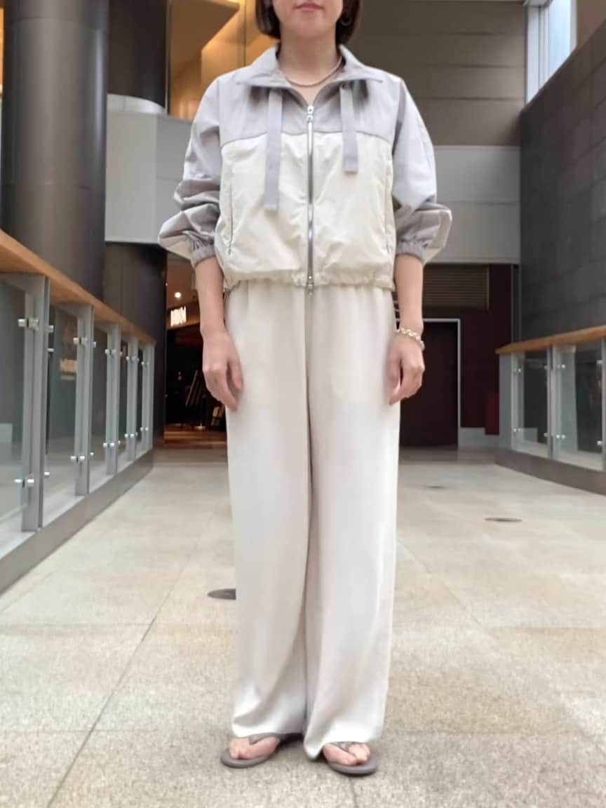スポーツテイストはモードに着こなすのがおすすめ。とろみのあるパンツに合わせて、色味を抑えナチュラルにまとめました。