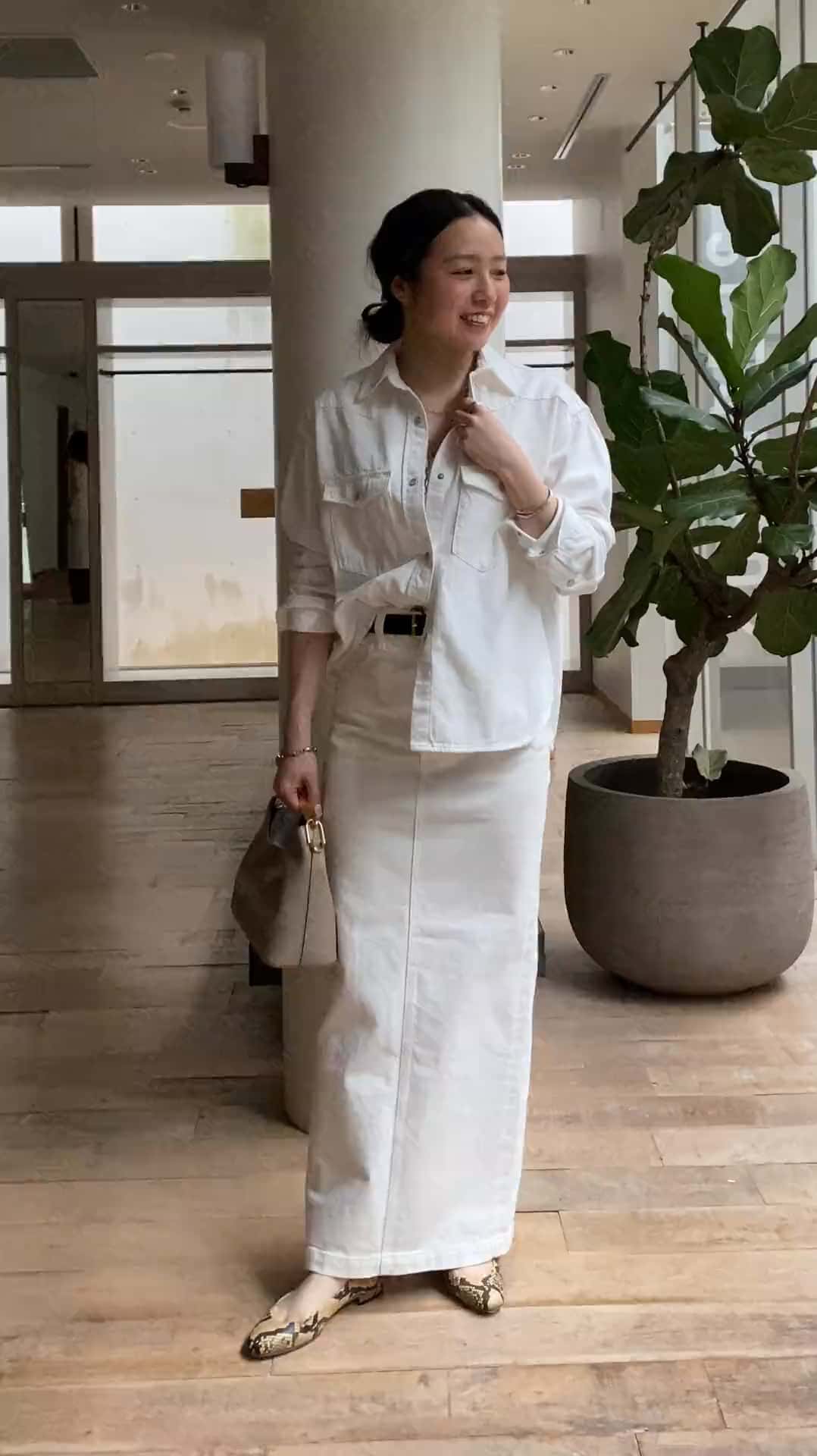 上下ホワイトデニムで統一感を出しました😊インディゴデニムより綺麗見えが叶って、カジュアルに見えないところがポイントです🤤バッグや靴も革小物にしたことでより上品さが増すようにしました😏💛