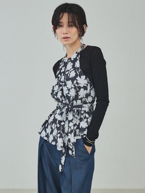 トップスと同素材(32520010003)で仕立てた、落ち感のあるフラワープリントパンツ。
