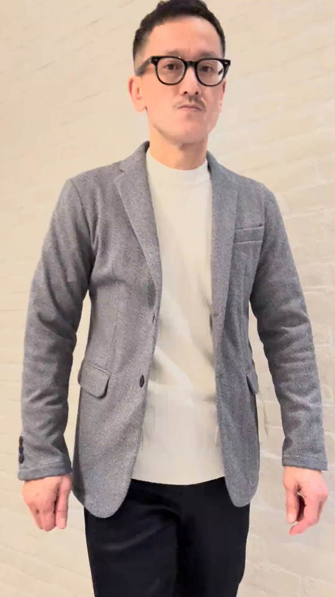 ジャケットは冬っぽさを残しつつ、スラックスはポンチ素材でアクティブに。